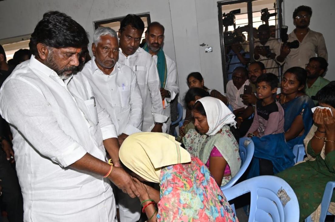 Deputy chief minister Mallu Bhatti Vikramarka and BC welfare minister Ponnam Prabhakar consoling bereaved family members of the two students who died from snakebite at Peddapur Gurukul Residential School in Metpally mandal of Jagtial district, on Tuesday.
