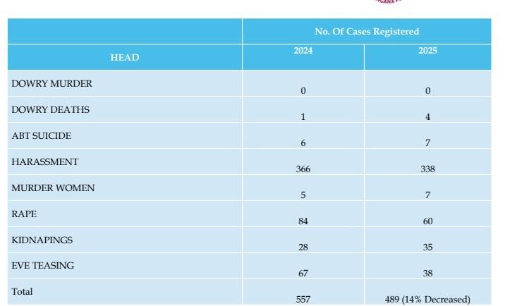 Significantly, rape cases declined by 46.4 per cent, with 45 cases reported in 2025 compared to 84 in 2024. However, dowry death cases increased to four in 2025 from one in 2024.