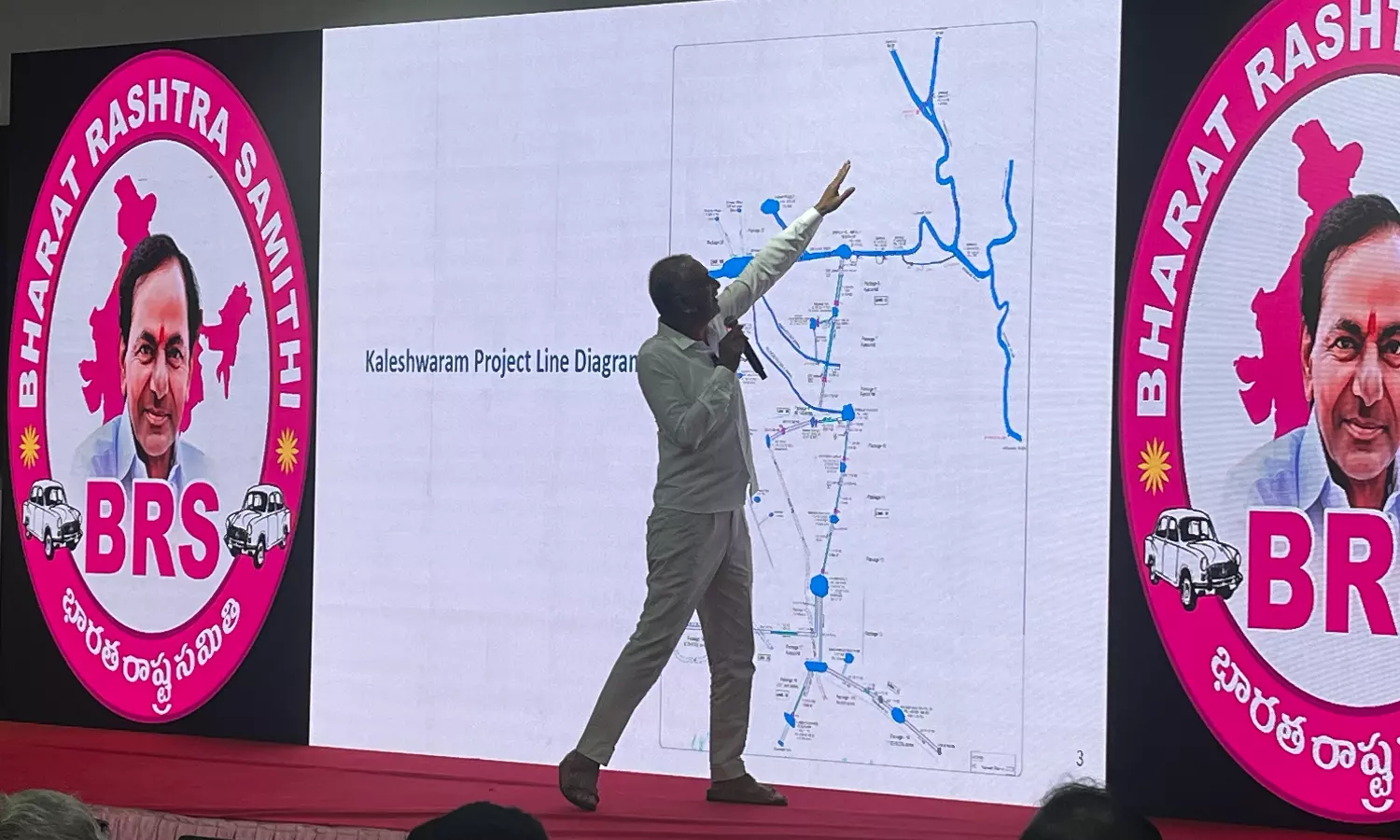 During his nearly hour-long presentation to party leaders including current and former MPs, MLAs, and MLCs, Harish Rao provided details showing excerpts of official documents related to the project, the reasons for the redesign of the project, addressed allegations on cost escalation, and how it is the Kaleshwaram project that made bumper paddy crops possible in Telangana.