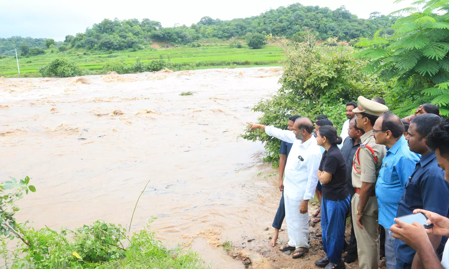 Government chief whip and Vemulawada MLA Aadi Srinivas inspected the water flow in Mulu wagu at Bathukamma Teppa and ordered officials to shift people in flood-affected areas to rehabilitation centres.