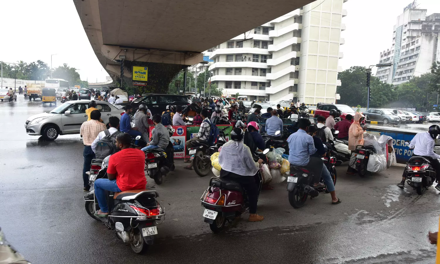 Worse, frequent traffic jams at the Chilakguda and Rathifile crossroads on either side strand the two-wheeler under the bridge, where water continuously falls on them.