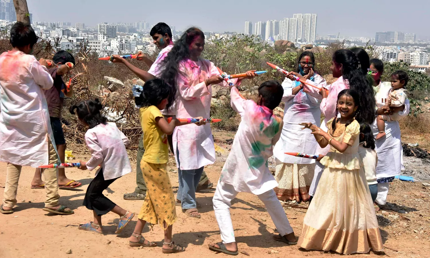 Hyderabad: The festival of colours, Holi, was celebrated with great pomp across the city, turning streets and venues into a vibrant spectacle. This year’s celebrations stretched over three days, giving residents an extra bonanza of colour and cheer.