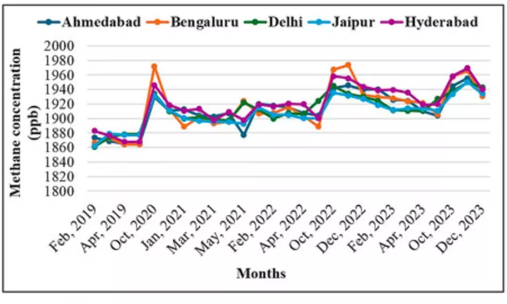 According to the study, methane levels in Hyderabad, which were just around 1,880 parts per billion (PPB) in 2019, rose to a peak of around 1,970 PPB in 2023.