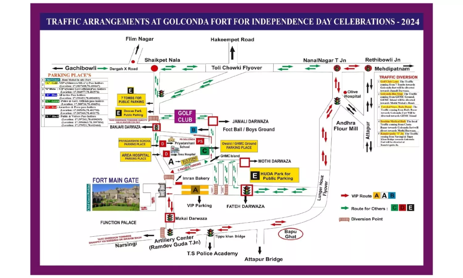 All the invitees with A (Gold), A (White), & B (Blue) car passes coming from Secunderaad, Banjara Hills, Masab Tank and Mehdipatnam side are requested to come via Rethi Bowli & Nanal Nagar Junctions and take left turn towards Balika Bhavan, Langar House flyover, Tippu Khan bridge, Ramdevguda junction and take right turn towards Makkai Darwaza and Golconda Fort Gate, after alighting at the Fort main gate.