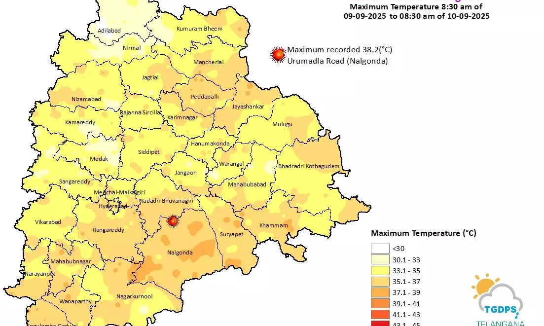 According to the Telangana State Development Planning Society (TSDPS), Hyderabad recorded a maximum temperature of 36.8°C at Gananka Bhavan, Khairatabad, during the 24-hour period ending 8:30 am on September 10.