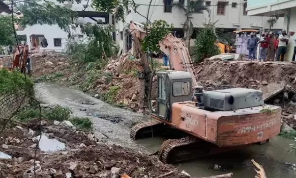 Hyderabad: HYDRAA initiated the demolition of illegal constructions along a nala near HUDA Trade Centre in Lingampally. Local corporator Nagendar Yadav intervened, obstructing the demolition and confronting HYDRAA officials. He demanded that the buildings on the nala be spared and proposed nala development on lands belonging to Someswara Temple instead.