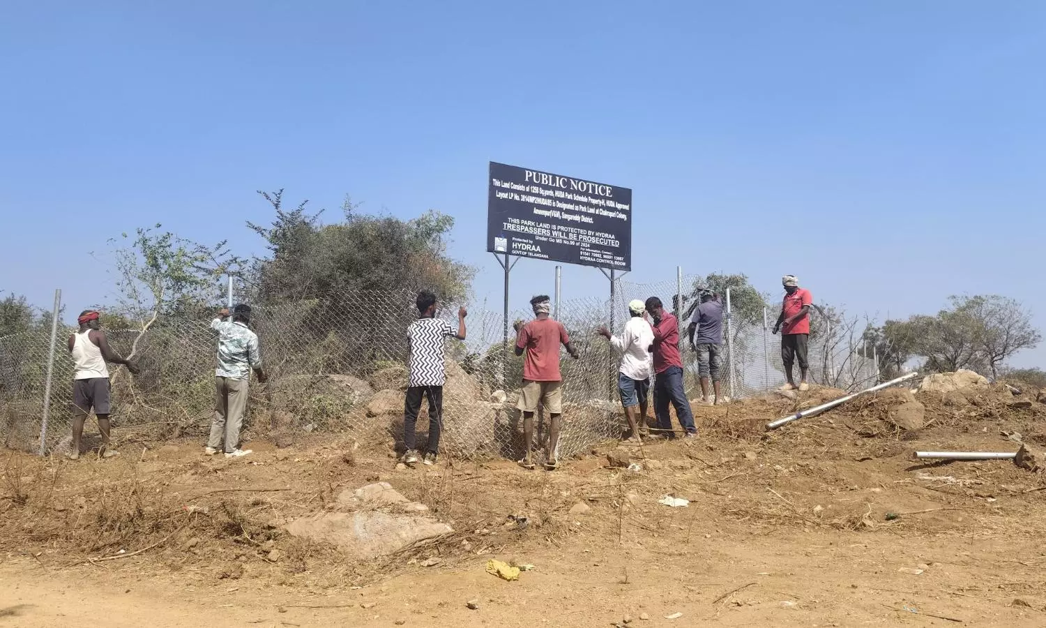After receiving complaints from the Charkapuri Colony Welfare Society members about encroachment, HYDRAA officials conducted a site enquiry and found that the boundary stones installed for demarcating the roadways and parklands were removed. On Sunday, officials placed fencing around the park and erected a board stating the land is protected by HYDRAA.