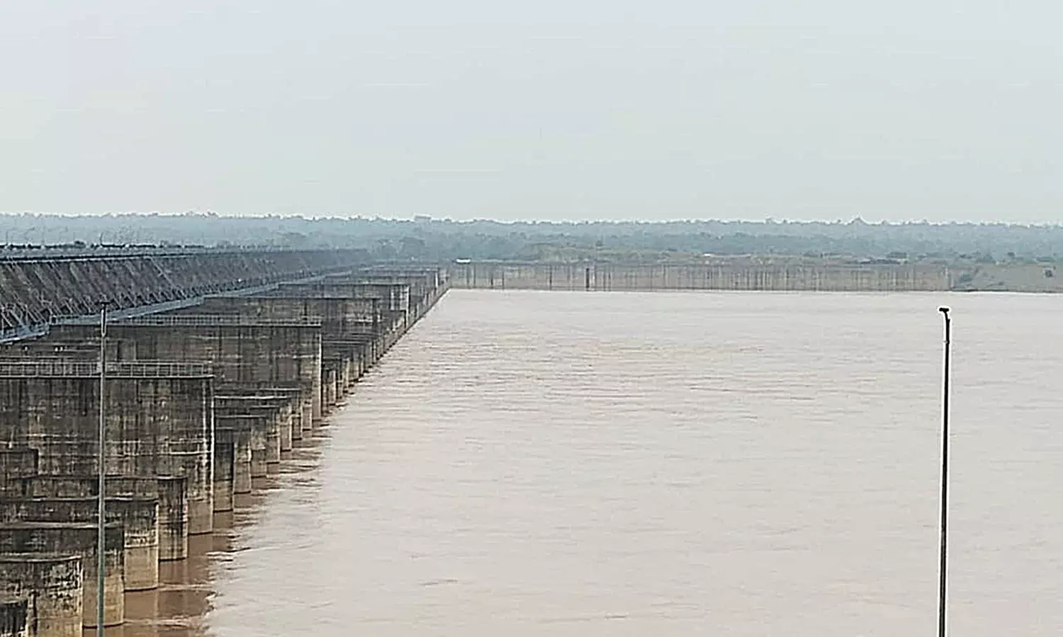 The Sammakka Sagar Barrage has recorded a total inflow of around 2,28,430 cusecs. Currently, about 2,32,670 cusecs are being released by lifting 22 spill gates. The present water storage level is 2.802 TMC ft, against its full capacity of 6.94 TMC ft.