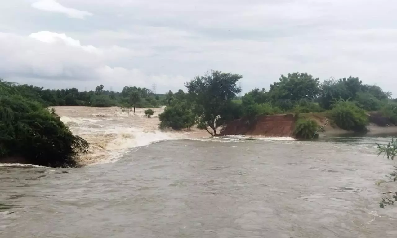 Nagarjunasagar Left Canal was breached at the mini-hydel plant at Palair after its compound wall collapsed.