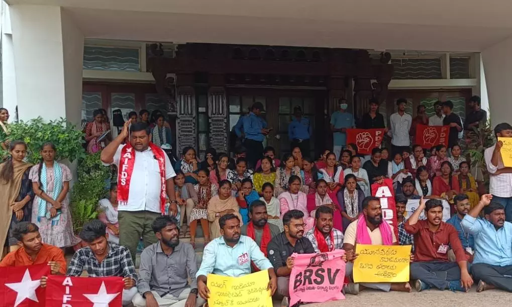 Warangal: Representatives of various student organisations staged a dharna at the administrative building of Kakatiya University in Hanamkonda on Thursday to oppose the university’s decision to allocate 15 acres of campus land for the establishment of the Young India Integrated School.