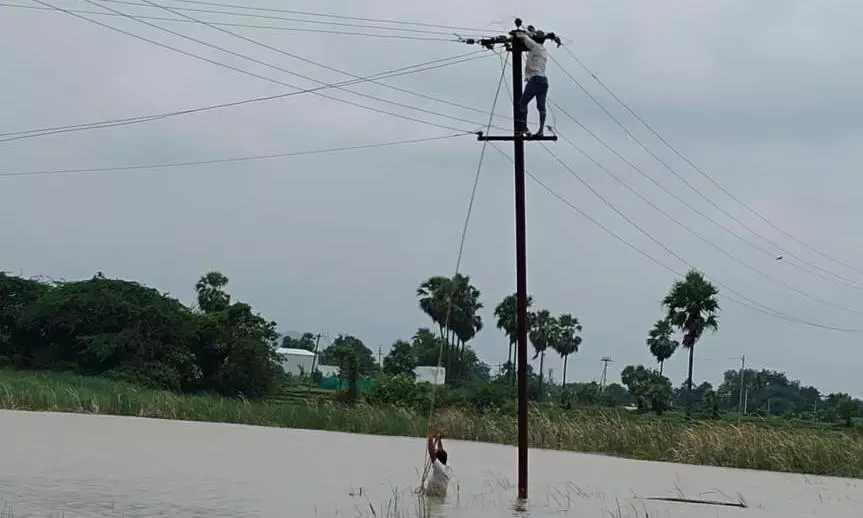 Hyderabad: In Suryapet district’s Chivvemla mandal, heavy rains caused a breakdown in the 11 kV Bibigudem feeder, disrupting power supply to the area. Demonstrating exceptional courage and dedication, TGSPDCL lineman Ramesh and junior lineman Madhusudan waded through a lake to reach the damaged power pole. Despite the challenging and hazardous conditions of working in water, they replaced a faulty disc insulator on the pole, successfully restoring electricity to the affected region.