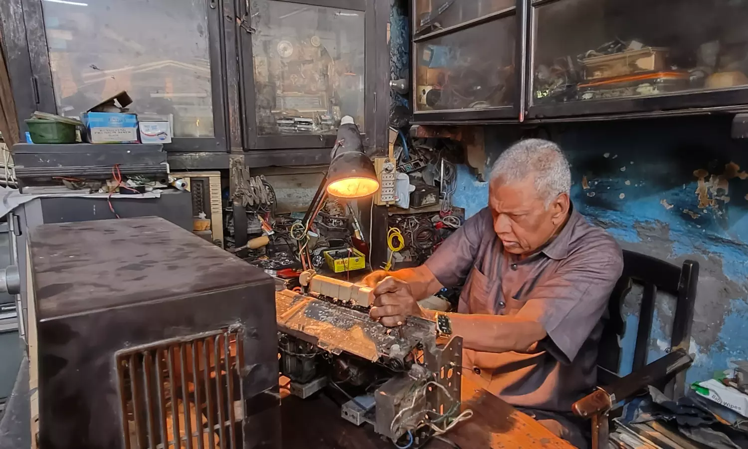 Md Moinuddin, 76, runs the store in Chatta Bazaar, past the wedding card shops. He sits on a stool outside, sometimes at his wooden table under a yellow lamp. Opposite, above an old cabinet, a vintage mirror, once used to repair television screens. “I would look in the mirror and see the placement of the TV,” he says, sitting beneath the 110-year-old iron beams. Wistfully narrating the art of fixing things.