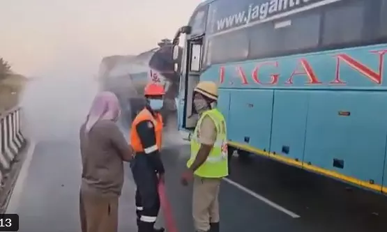 Major Mishap Averted on NH-44 as Private Travels Bus Crashes Into Acid Tanker