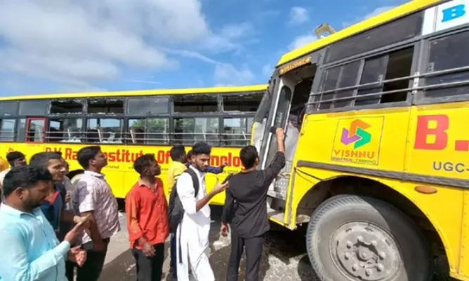 Medak: A tragic accident occurred near Narsapur in Medak district on Friday when two college buses from BVRIT College collided head-on.The incident took place at 9 am near Classic Gardens in the city. One of the drivers died on the spot, while the other sustained injuries. The deceased driver has been identified as Nagarju (50).Also 20 students were injured in the crash and have been transported to various hospitals in Hyderabad for treatment.
