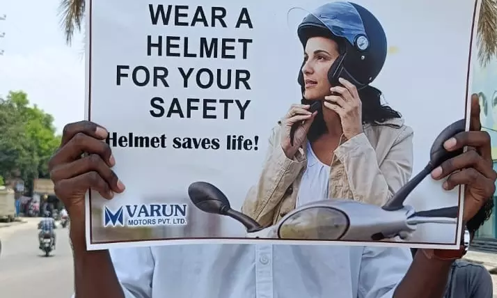Nizamabad: Two minor boys caught speeding on motorbikes faced unique punishment from Nizamabad police on Sunday. Directed by Commissioner P. Sai Chaitanya, who noticed their reckless driving on Saturday, the police apprehended the minors and obtained their details. On Sunday, the boys were instructed to stand at traffic police booths near the old collectorate crossroads, displaying placards with traffic rules, including slogans like "Wear a helmet for your safety."