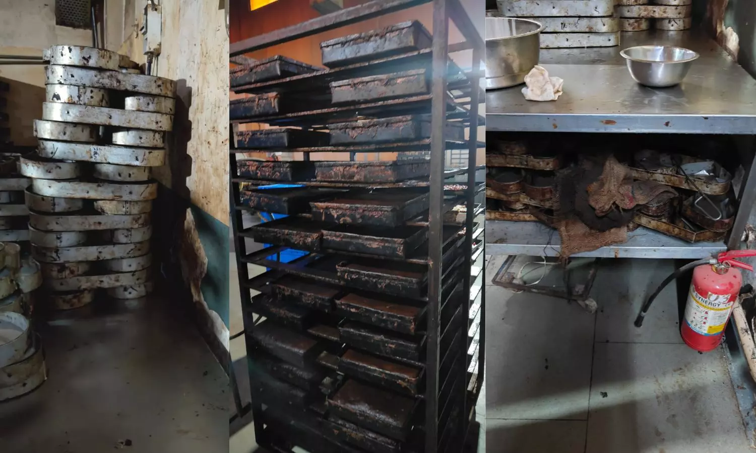 The inspection also found several expired products, including Kesar Syrup (Sep 2024), Butter (June 2024), and flavor compounds that had long passed their expiration dates. Infrastructure conditions were also poor, with walls and ceilings showing signs of deterioration and flaking particles. Refrigerators were maintained in an unhygienic condition, with food waste littering the interior. Several food items were stored in unhygienic plastic drums, further raising concerns.