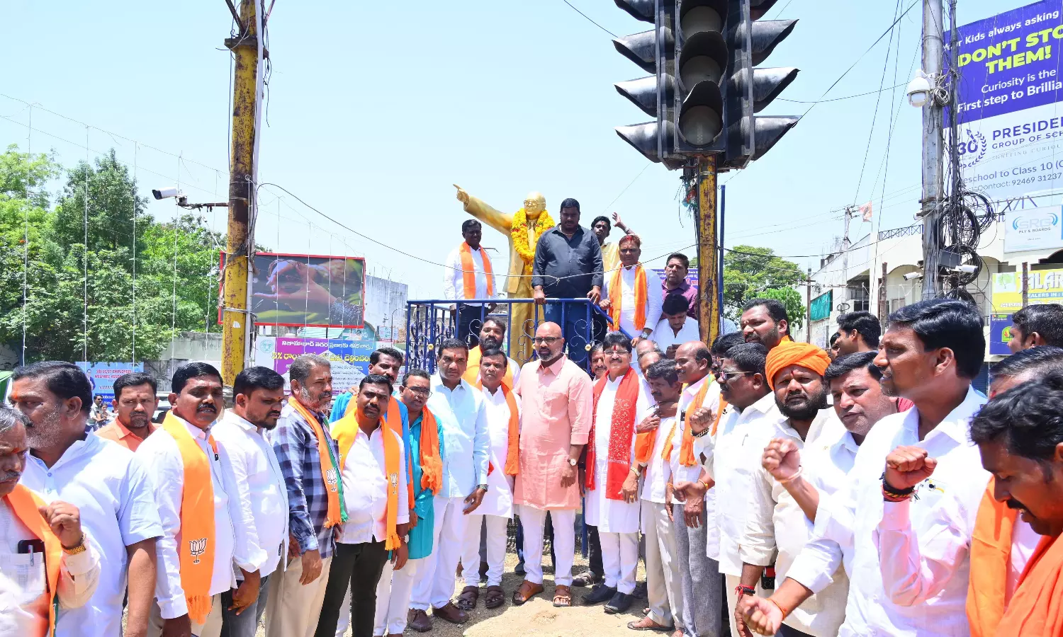 As part of Gaon Chalo, Basti Chalo programme, MP Arvind, BJP MLAs Dhanpal Suryanarayana Gupta, Paidi Rakesh Reddy, and National Turmeric Board chairman Palle Ganga Reddy offered milk to the statue of Dr BR Ambedkar here at Phulong cross roads on Sunday. Speaking to reporters, MP Arvind came down heavily on BRS and Congress parties.