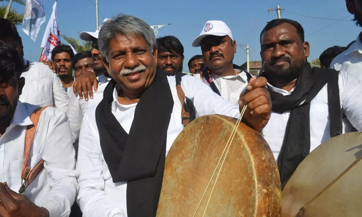 Madiga called on Madigas to “fight tooth and nail” to realise the SC’s decision, criticising the government for recruiting 11,000 teachers without applying the categorisation, which he said adversely affected educated, unemployed Madiga youth. He appealed to wealthier Madiga families to provide ‘Dappus’ — symbolic cultural and occupational drums — to those unable to afford them, urging every attendee to bring one to the Hyderabad meeting.
