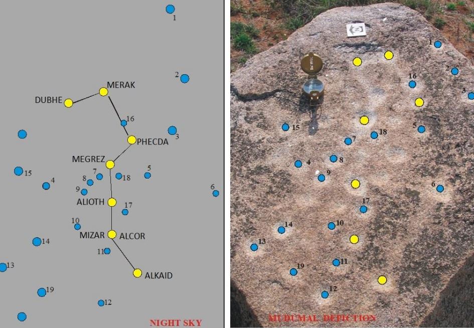In Telangana, however, the menhirs appear to have great astronomical significance as they have two depictions of Ursa Major constellation, also known as Saptarishi mandala. The seven-star constellation has two stars called Dubhe and Merak that point towards the North Star.