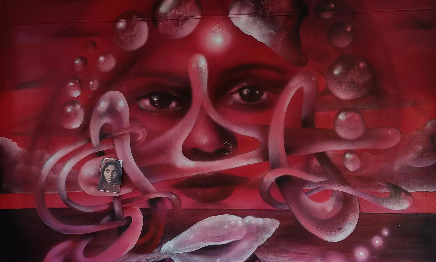 His mural, which presents a fusion of a young Indian girl’s face with abstract elements, represents the connection between the microcosmic individual and the macrocosmic universe.