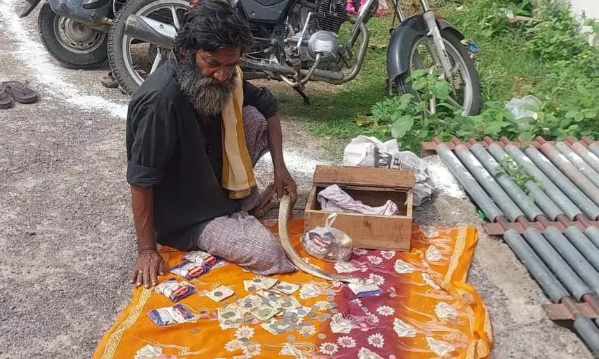 Cruelty prevention manager of the foundation A. Goutham said that during their inspection, their team found the two snake charmers outside the Pochamma temple and Gidde Permanudla temple in the Kothirampur area. They observed worshippers pouring milk on the snakes, a practice on the occasion of Naga Panchami festival, while the snake charmers collected money in return from them.