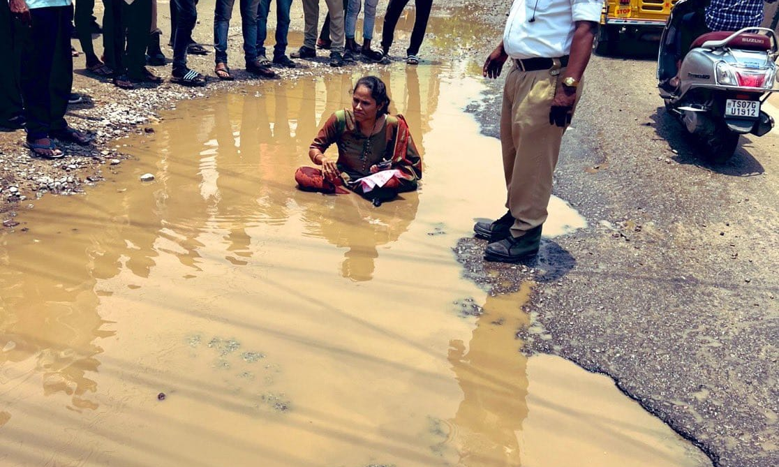 Hyderabad: In a unique protest, a woman on Thursday squatted in water on the main road at Nagole demanding officials to repair pothole-riddled roads in Anandnagar Colony.