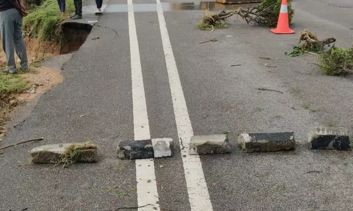 Kamareddy: Police on Friday issued an update on the damage to NH-44 caused by heavy rains. The recently repaired stretch has caved in again, leaving only one lane open for emergency vehicles. Traffic diversions at Medchal, Armoor, and Nirmal remain in place. Police have urged commuters to take alternative routes.