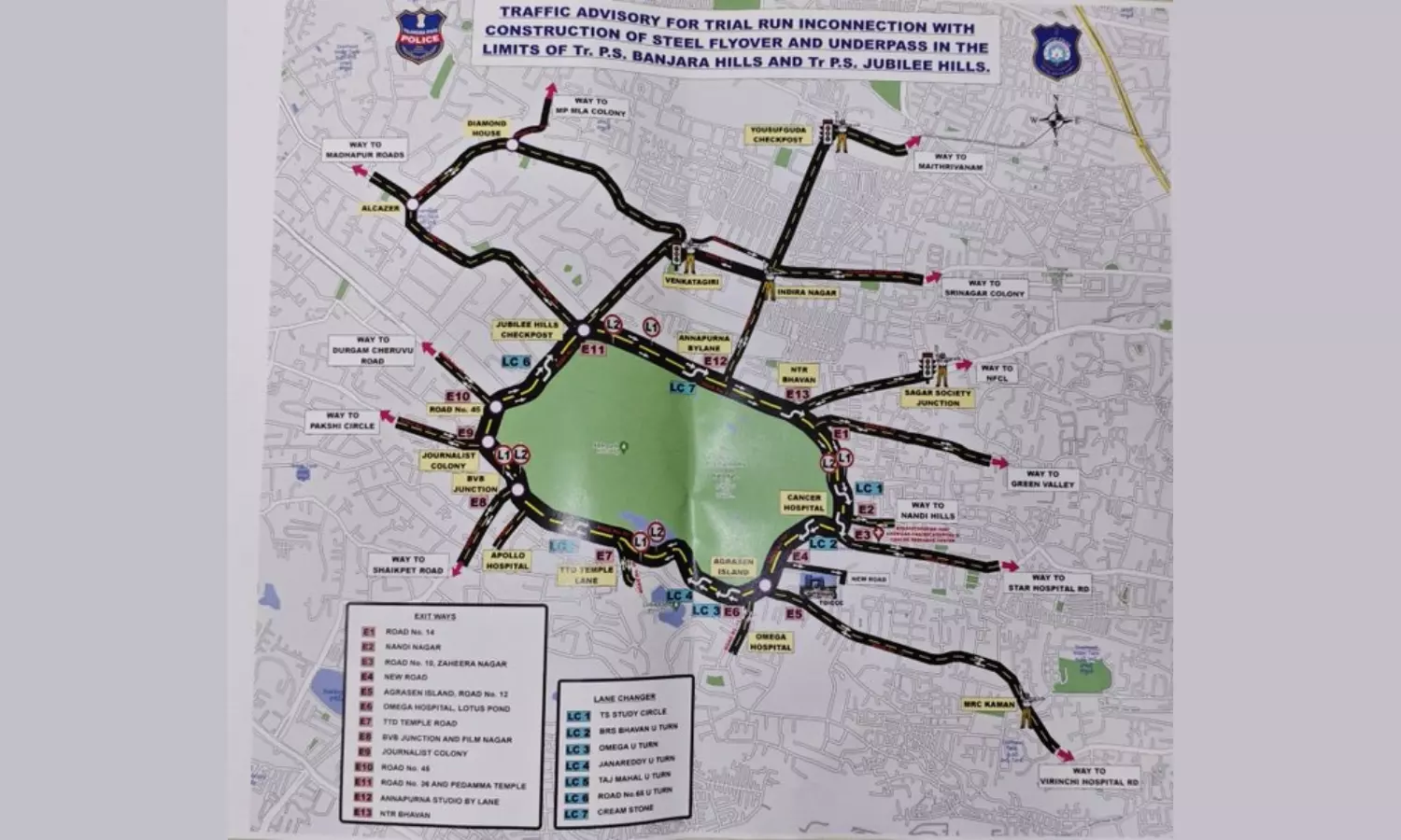 Commuters travelling from NFCL towards Jubilee Hills, Road No. 36, Road No. 45, Sagar Society, and the Durgam Cheruvu Cable Bridge were advised to take a diversion via NTR Bhavan, Basavatarakam Cancer Hospital, Agrasen Island and Omega Hospital to reach their destinations.