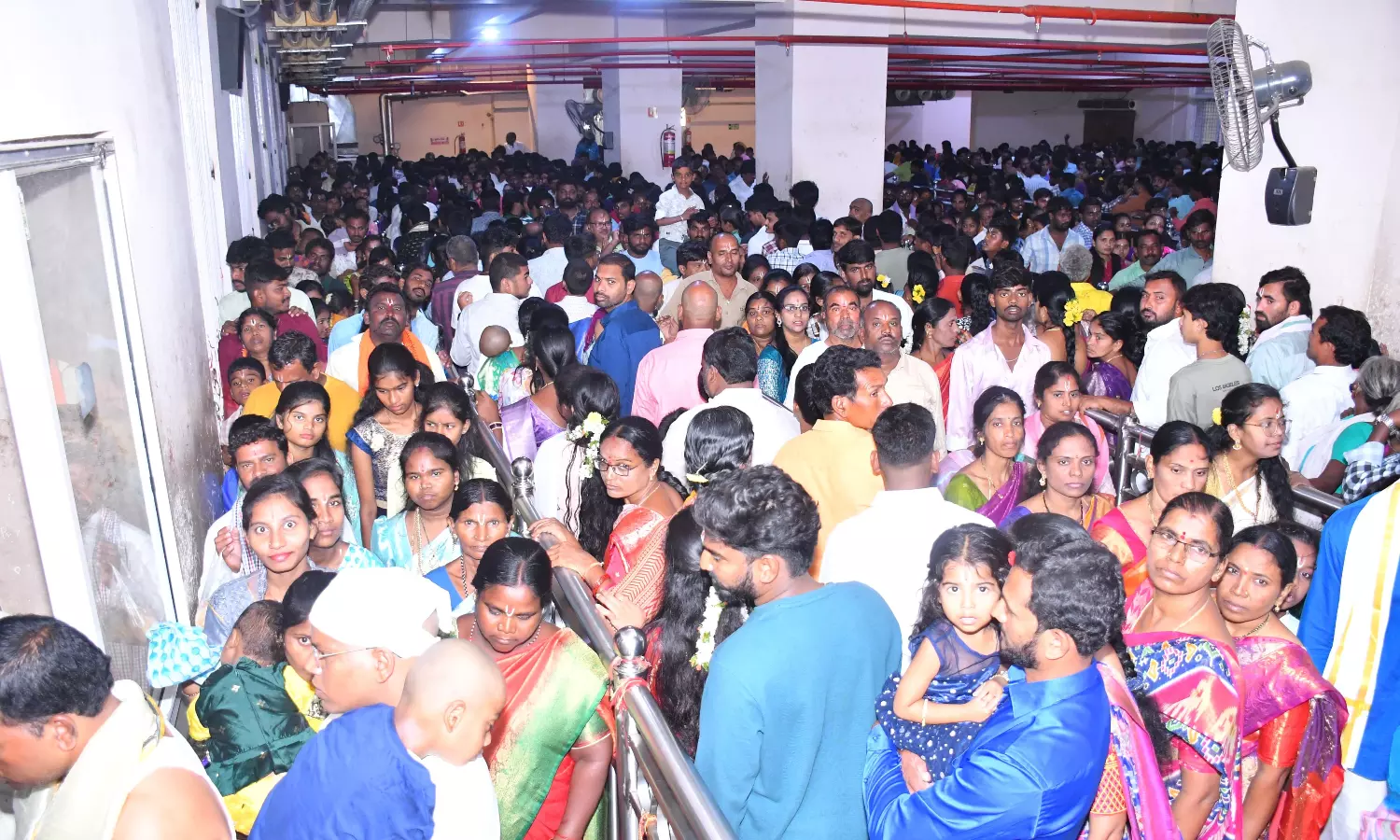 The Madaveedulu were also packed with devotees. Serpentine queues were seen at the prasadam counters and the Kalyanakatta also was witnessed huge rush of devotees who came for offer their hair.