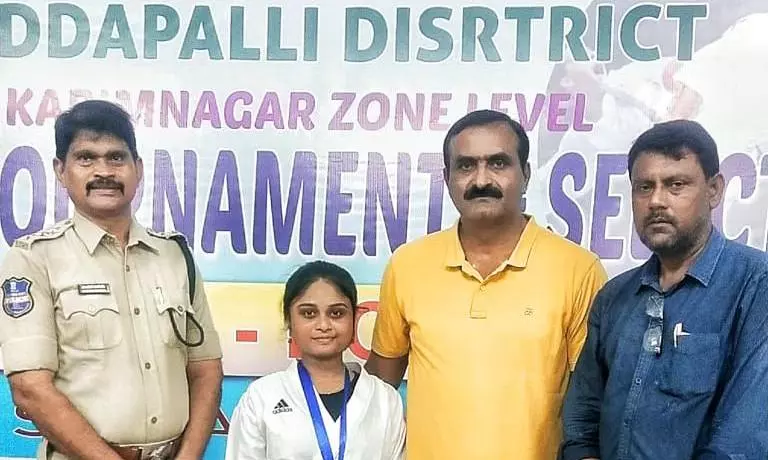 Karimnagar: Tagarapu Srihitha Raj, a 16-year-old from Jyothi Nagar, Godavarikhani, Peddapalli district, secured a gold medal in the under-17 girls' category at the State-Level Karate Tournament conducted under the School Games Federation (SGF) by the state government.