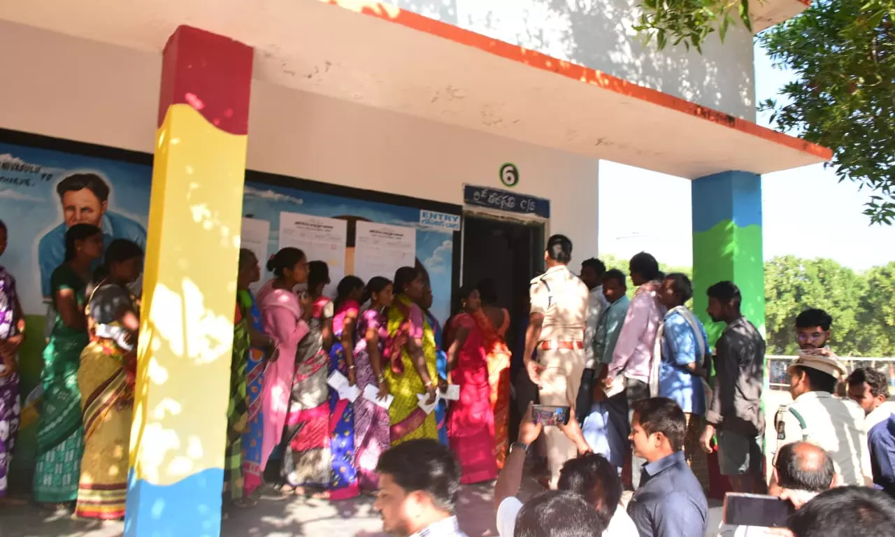 Voters queued up to caste their vote in first phase of Gram Panchayat Polls at a polling station in Jogulamba Gadwal district.