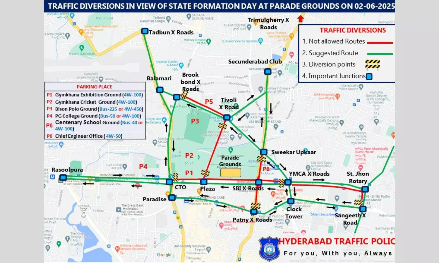 Hyderabad: The traffic police imposed diversions and made parking arrangements in connection with Telangana State Formation Day celebrations at Gun Park Nampally and Parade Grounds in Secunderabad on June 2.