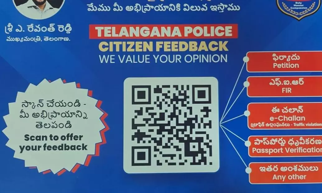 Days after Director General of Police (DGP) Jitender launched the Citizen Feedback system by installing QR codes in all police stations across Telangana to collect citizen feedback, a massive response was recorded. The Ramagundam Police Commissionerate topped the list in sending feedback to police officials, followed by Hyderabad and Cyberabad. In rural areas, citizens from Mulugu sent the highest number of feedback reports to CID officials.