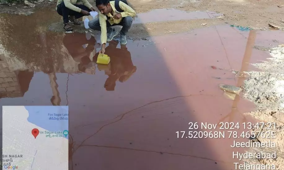 Hyderabad:Red-coloured water flowing on the road in Venkatadrinagar, near the Jeedimetla Industrial Estate in Hyderabad on Monday evening, alarmed residents. The water, did not have any chemical smell. Authorities collected samples for testing to check if chemicals were involved.