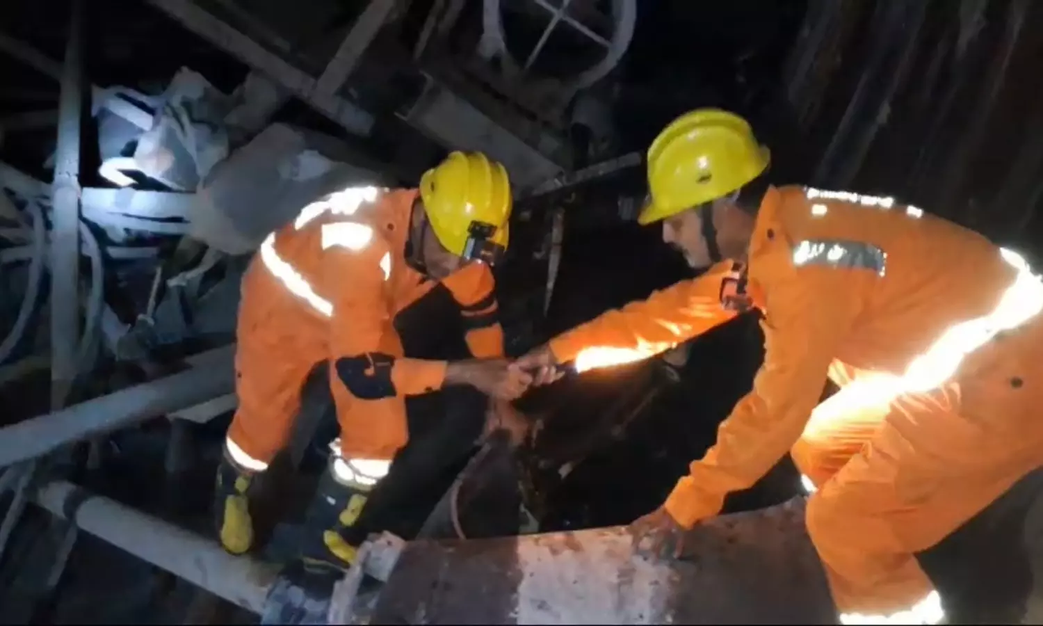 The NDRF team reaches tunnel boring machine and struggles against water, slush, and debris in search of missing workers.