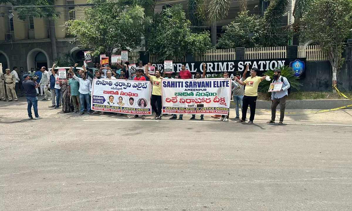 Hyderabad: Scores of victims of Sahiti Sarvani Elite from Ameenpur staged a protest in front of the office of Hyderabad Central Crime Station (CCS) in Basheerbagh here on Saturday demanding justice for them.