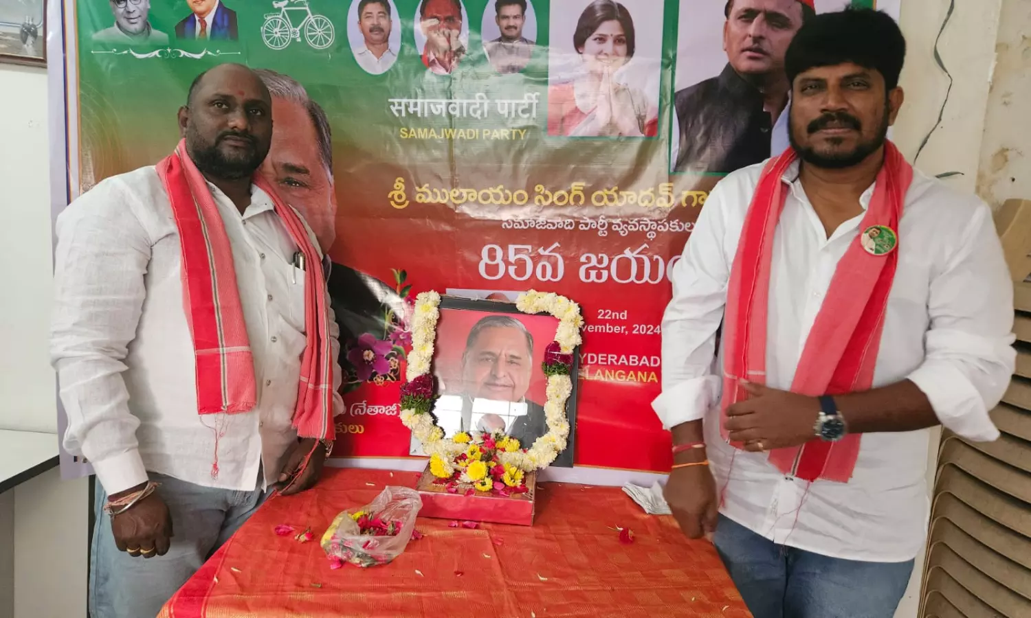 Hyderabad: The 85th birth anniversary of the founder of Samajwadi Party, Mulayam Singh Yadav was celebrated with great enthusiasm in Hyderabad. Tributes were paid to his portrait, and his contributions were praised. Food distribution programs were organized at various locations. In honor of Mulayam Singh Yadav's birthday, meals were provided to the poor.
