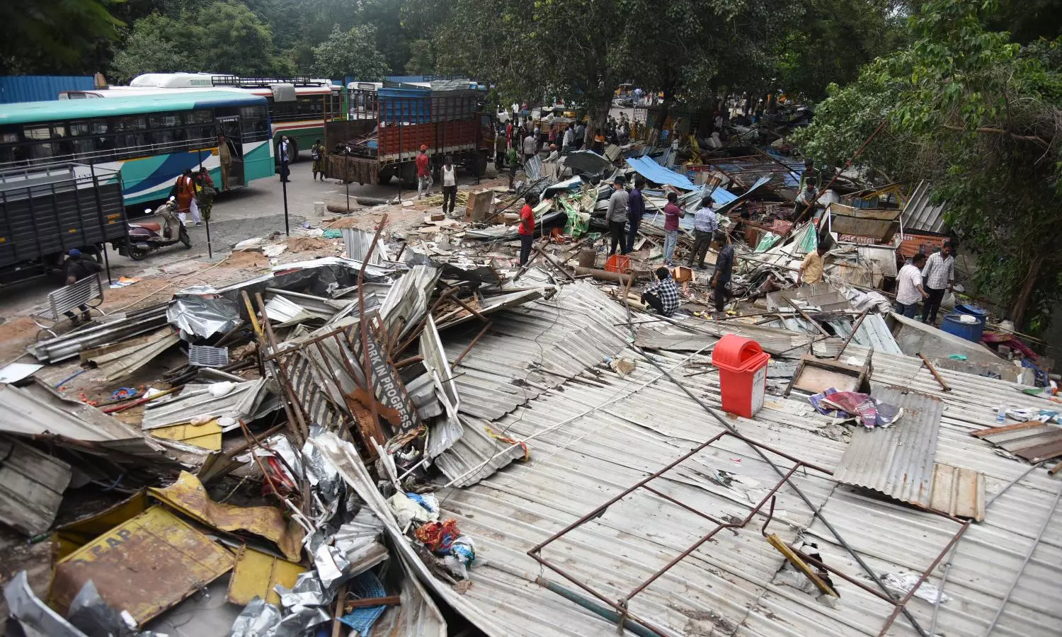 Officials said the structures, which included hotels, eateries and iron sheds, had stood illegally for years, even over a nala, despite repeated notices.