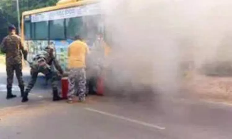 Acting swiftly, Anjaiah used a fire extinguisher to control the flames while four staff members led the students to safety under a nearby tree. Army personnel on guard duty and passing motorists also helped the school staff in moving the children to safety. Trimulgherry SHO G. Nagaraju said the police alerted the students’ parents and ensured their safe return home, while another bus was arranged.