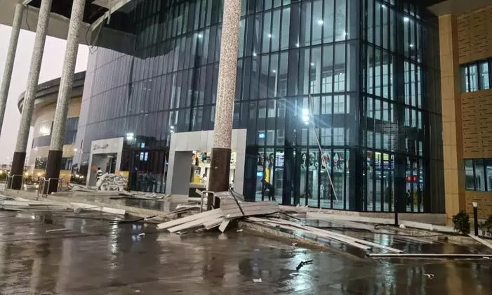 According to officials from the railways’ construction wing, strong winds and heavy rain caused the false ceiling panels at Cherlapally station to collapse. The terminal is built at an elevation of five metres higher than the surrounding areas. Additionally, the portico ceiling is at a height of 18 metres, making the overall elevation of the station nearly 25 metres from ground level. The absence of built-up areas or trees nearby allowed high-speed winds to directly impact the structure.
