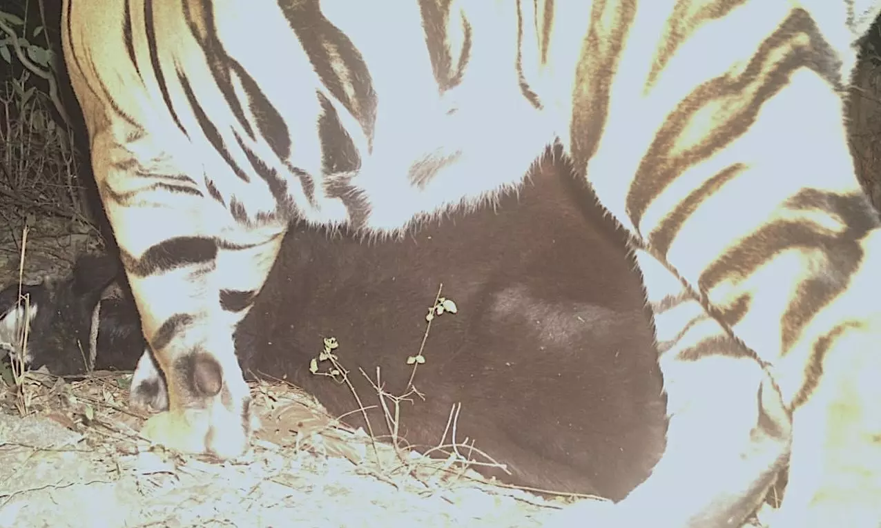 While the tiger, which killed a cow near Dattaipally on Monday returned to the kill, it reportedly did not feed on it and left the place soon after. “Maybe it got disturbed because of the flash from the trap camera,” an official said. The farmer, whose cow was killed, also reported to the forest officials that two more of his cows were missing and it is presumed that the tiger may have killed them too and dragged at least one away to a sheltered place where it may have fed on it.