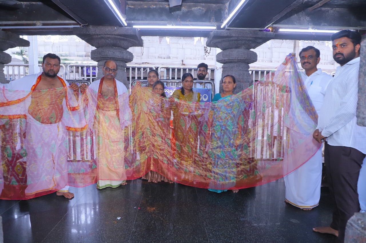 Soon after offering prayers, they presented the sari and shawl to temple executive officer K. Vinod Reddy for offering them to the deities.