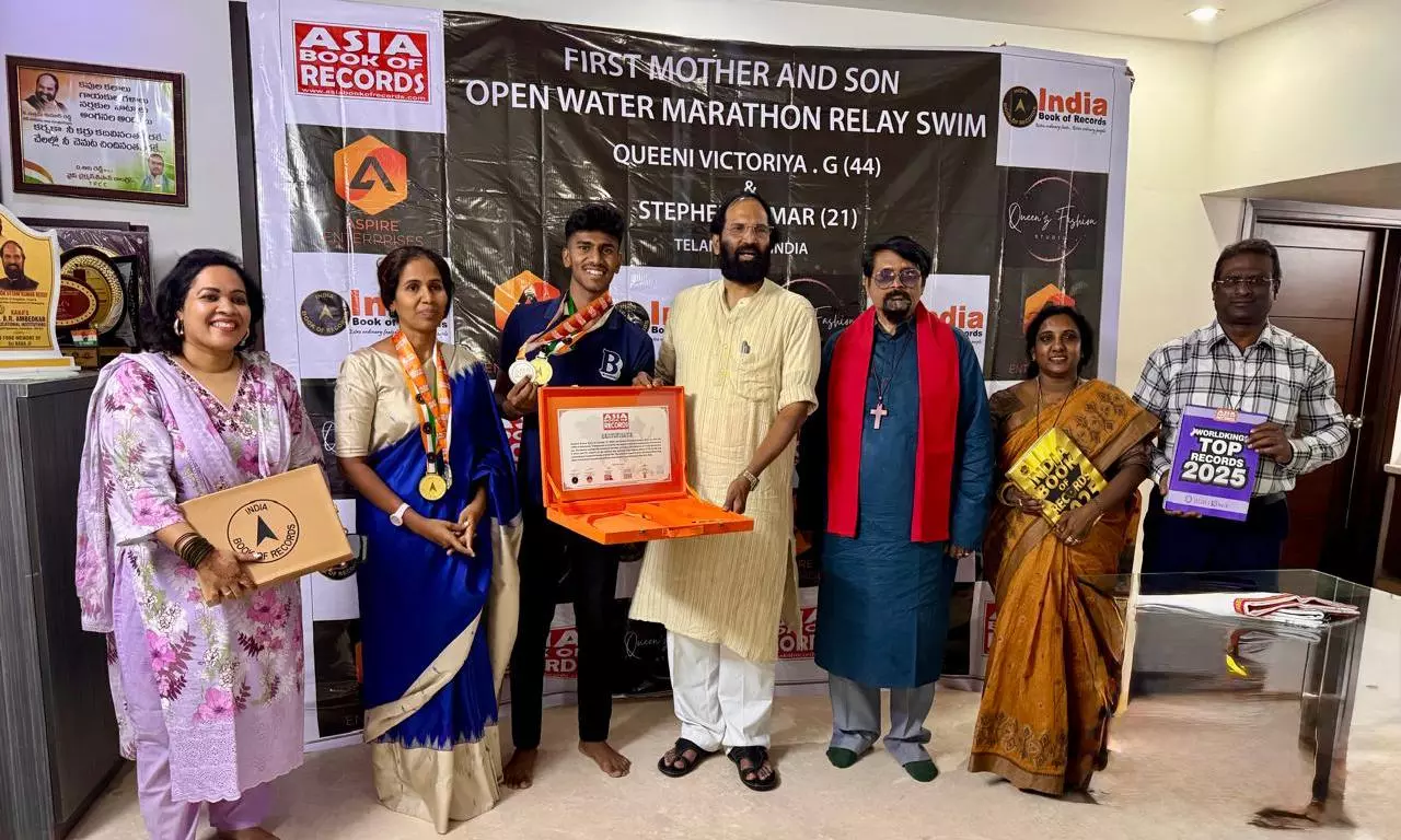 Hyderabad: In a moment of immense pride for Telangana, Minister for Civil Supplies and Irrigation, Mr. Uttam Kumar Reddy, on Wednesday felicitated Queeni Victorya and her son Stephen Kumar for their extraordinary achievement in world open-water swimming. The duo’s remarkable feat was officially recognized by the Asian Book of Records, solidifying their place in history.