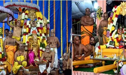 The wedding rituals commenced at 10:30 a.m. in the Mithila Mandapam and are set to continue until 12:30 p.m. The ceremonies feature the chanting of Vedic mantras, reaching a peak during the auspicious Abhijit lagna, when a traditional mixture of cumin, jaggery, and cumin is placed on the heads of Sita and Rama, symbolizing prosperity. Following the Talambra ceremony, the Brahma Bandhan ritual, also known as Brahmamudi, is conducted. The newlywed divine couple receives blessings through the chanting of the Chaturveda.