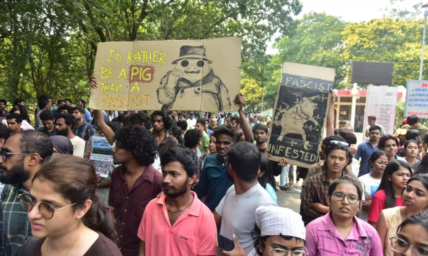 The protesters displayed placards that contained demands of “Save HCU Biodiversity”.
