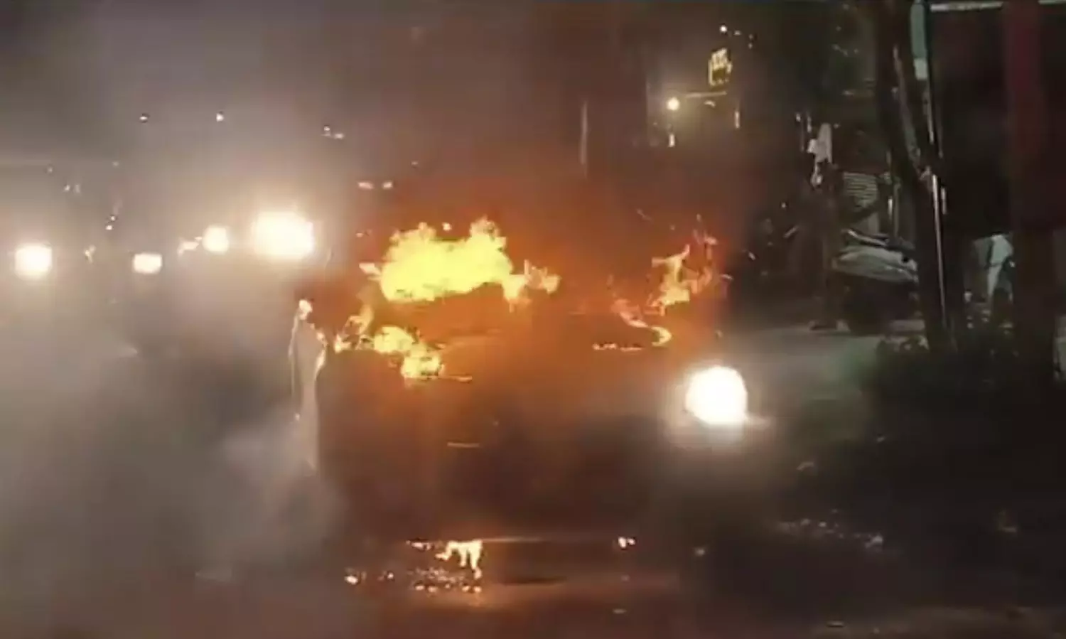 The driver's quick response prevented further damage, but the incident alarmed nearby residents as flames erupted from the vehicle.