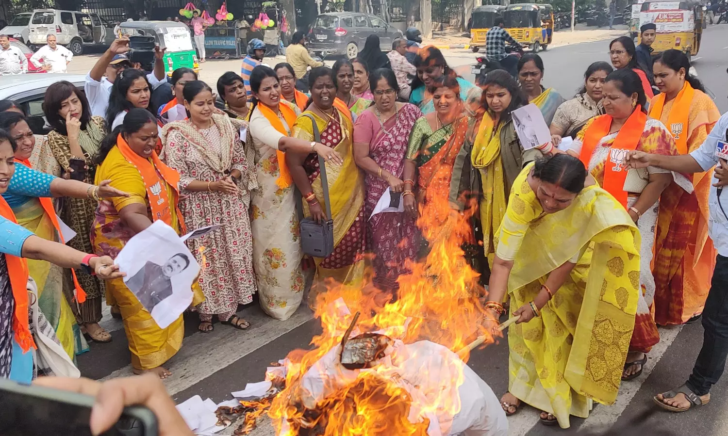 Hyderabad: The BJP's Mahila Morcha workers burned an effigy of Khairatabad MLA Danam Nagender on Thursday for his "sarcastic and derogatory" comments against women, film artistes and BJP MP Kangana Ranaut.