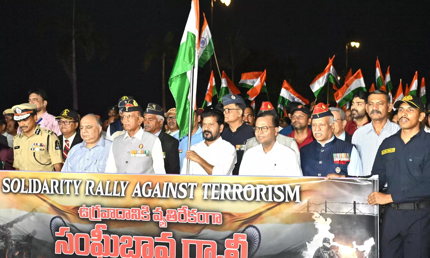 Leading the solidarity rally, holding a National Flag, Revanth Reddy marched along with thousands of citizens holding the Tricolour, from the Telangana Secretariat to Indira Gandhi statue at Necklace Road. The rally echoed with slogans of “Bharat Mata ki Jai,” “Jai Jawan,” and “Vande Mataram.” “All four crore people of Telangana stand with our jawans in this operation,” Revanth said.