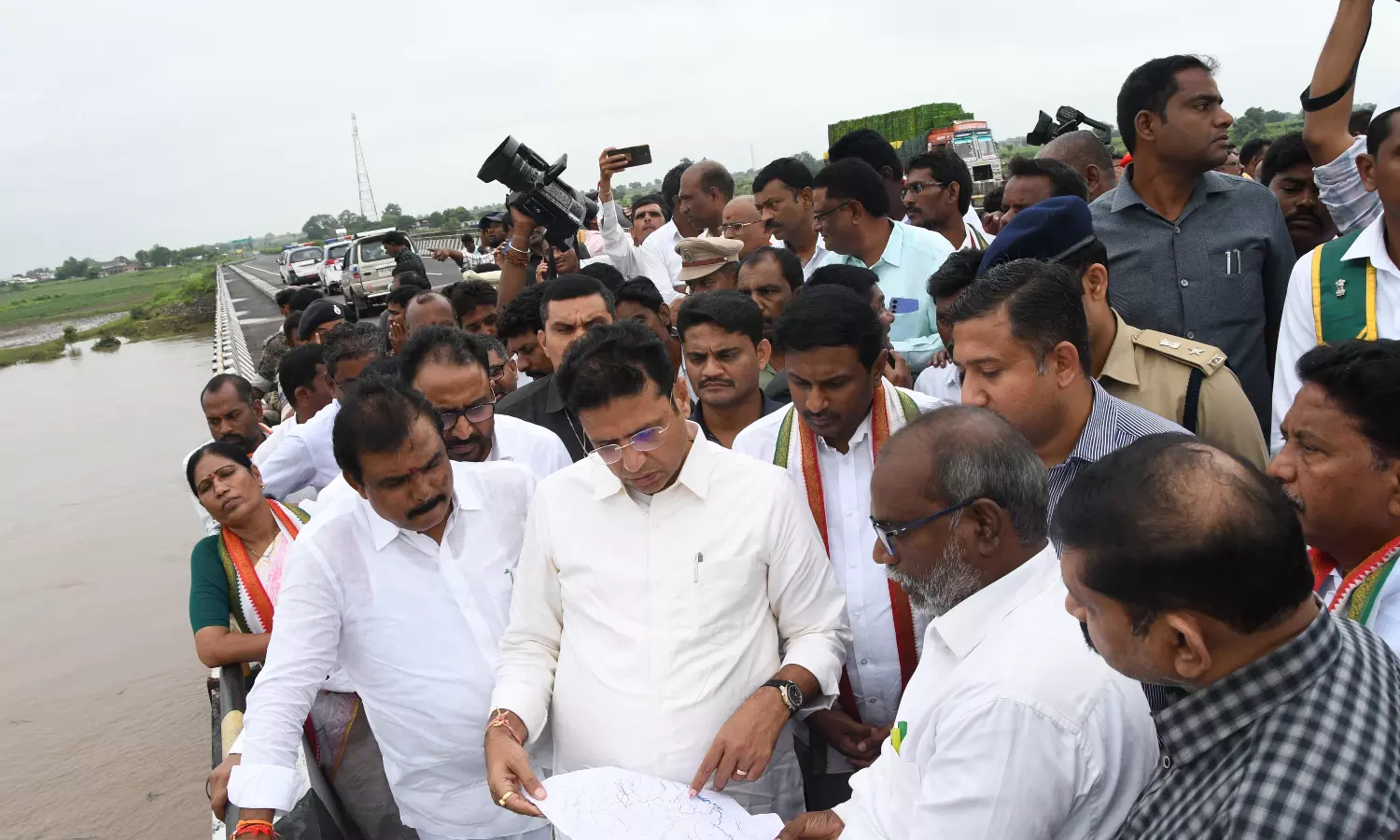 Along with local MLA Payal Shankar, collector Rajarshi Shah and SP Gause Alam, Sridhar Babu visited Penganga to learn about the flood situation and inflows and outflows.