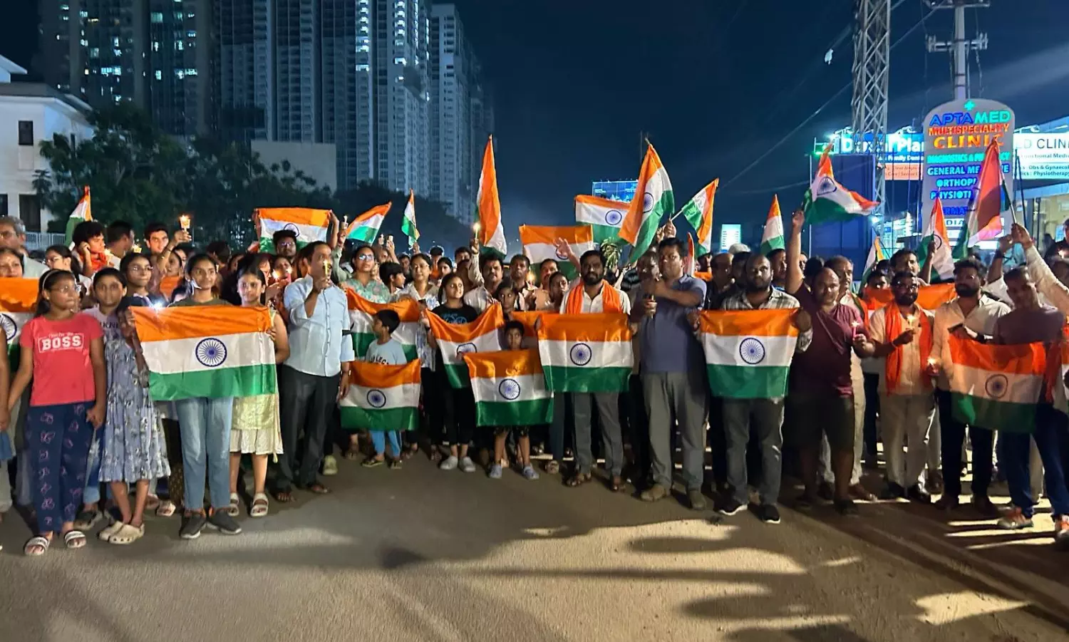 Hyderabad: In a solemn tribute to the 28 civilians killed in the recent terror attack in Pahalgam, Jammu and Kashmir, the Tellapur Neighbourhood Association on Tuesday evening organised a candlelight peace rally. More than 500 residents from different communities across Tellapur participated in the rally, which began with a five-minute silence in memory of the victims. Carrying candles and tricolour flags, raising patriotic slogans, the participants marched together and delivered a strong message against terrorism. The participants called for peace, unity and solidarity with the families of those affected by the attack.